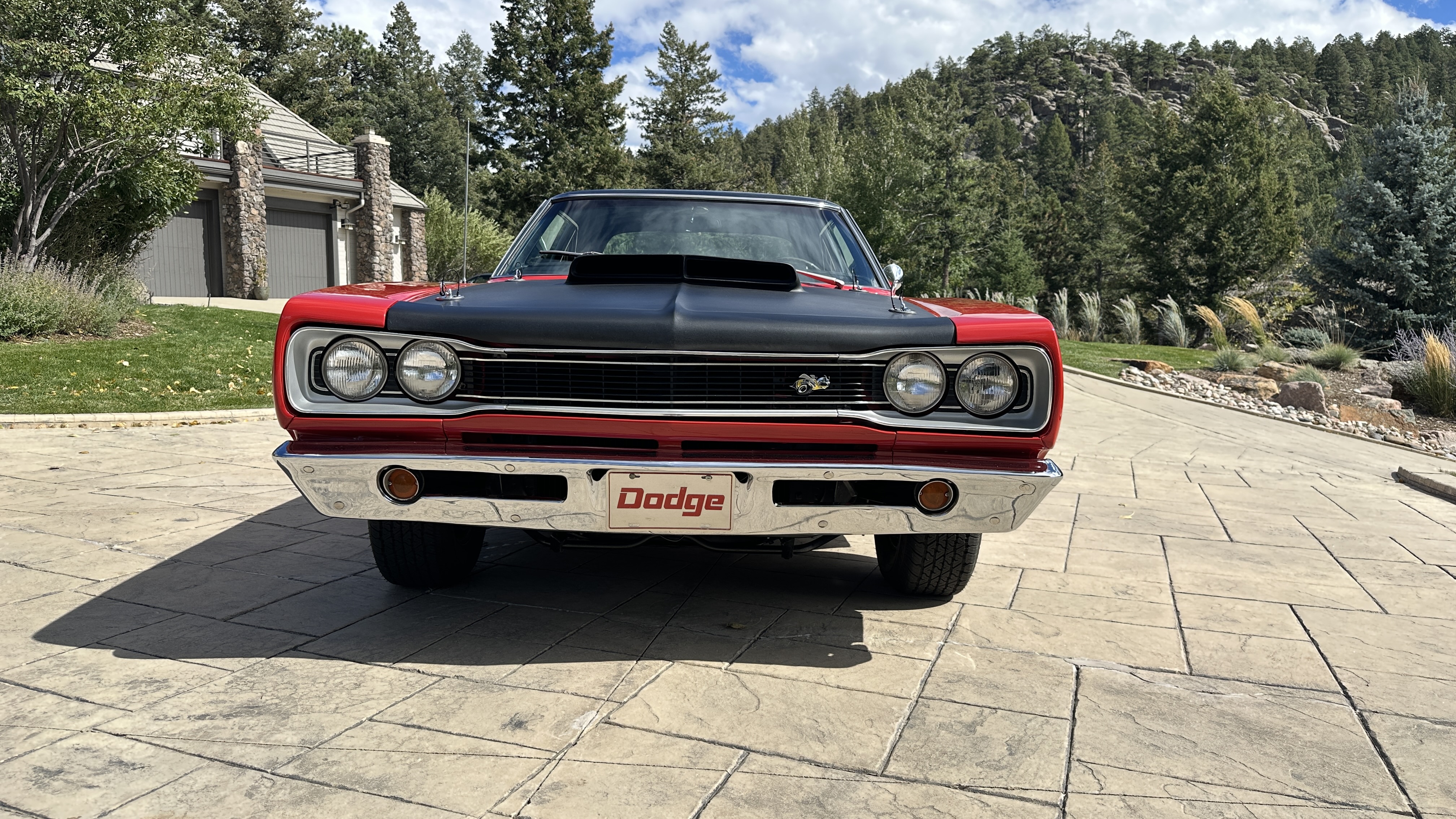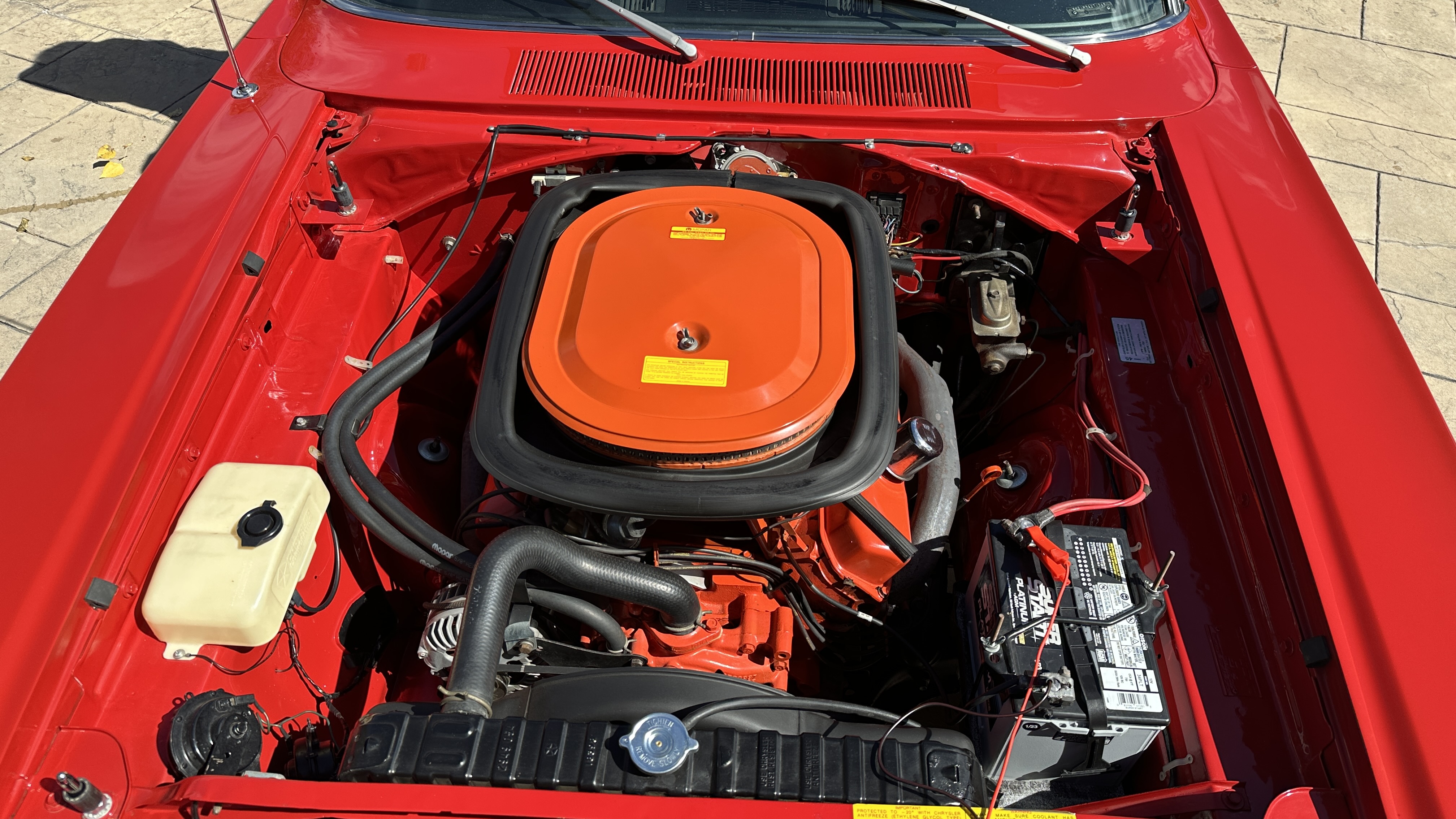 The car is a matching engine car with original rear end and is listed in the Super Bee Registry as a true A12 M-code car. Painted in the original F6 red color with a black vinyl top and matching black interior, this is an original 4-speed car. With the correct lift-off hood, billet hood supports, side scoops. Interior and exterior finish are in excellent shape. Hp and a whopping 490 lb-ft of torque.